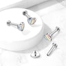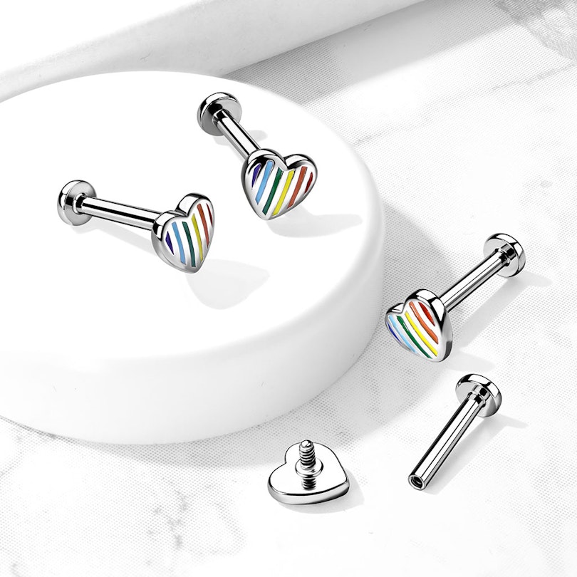 Labretul pe care îl vezi aici are o inimă în partea din față, care are un filet în spate. Filetul este înșurubat în bară. Acesta este avantajul barelor cu filet intern. La filetele externe, filetul este înșurubat peste bara în partea de jos, având dezavantajul că poate cauza mici zgârieturi în interiorul piercing-ului tău -- Asta nu se va întâmpla cu acest labret.