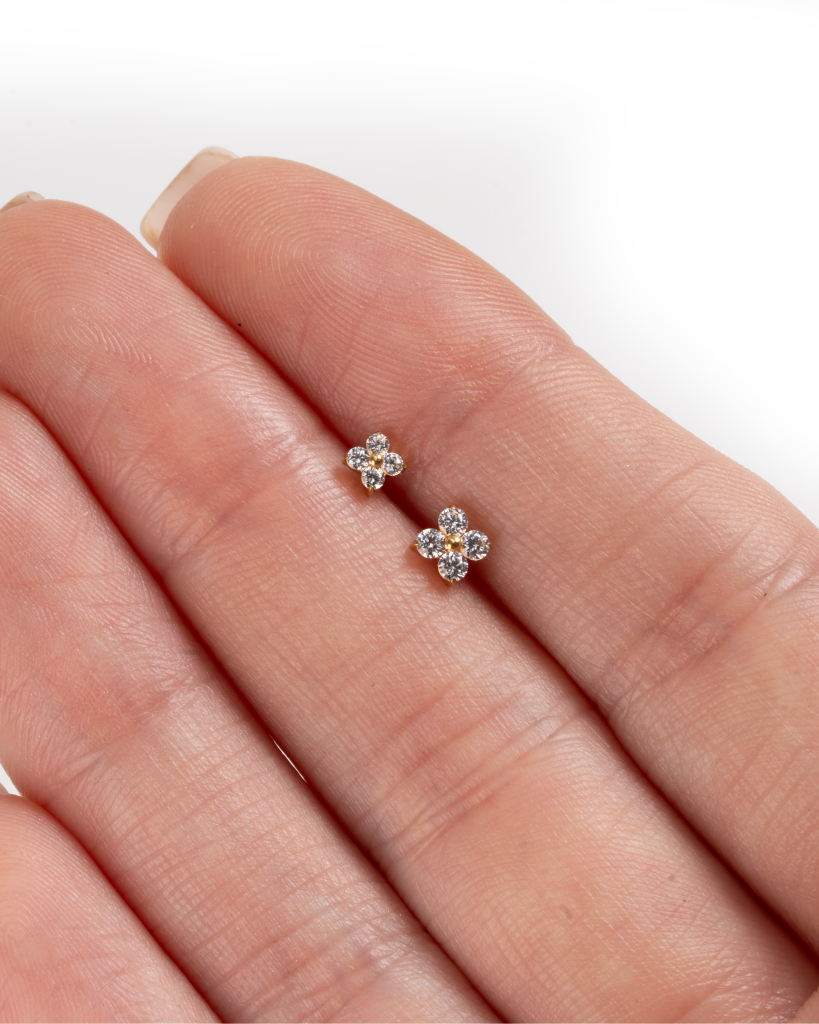 Labretul din titan cu floare în miniatură aduce un detaliu floral delicat, format din pietricele mici aranjate în formă de floare. Așezate într-o montură cu gheruțe, pietricelele stau aproape de piele, fiind un detaliu care nu încarcă. Disponibil în culorile auriu și argintiu și în două mărimi, varianta mai mică este subtilă, în timp ce cea mai mare are puțin mai multă prezență. Purtate împreună, creează un look stratificat, lejer, totuși bine gândit.