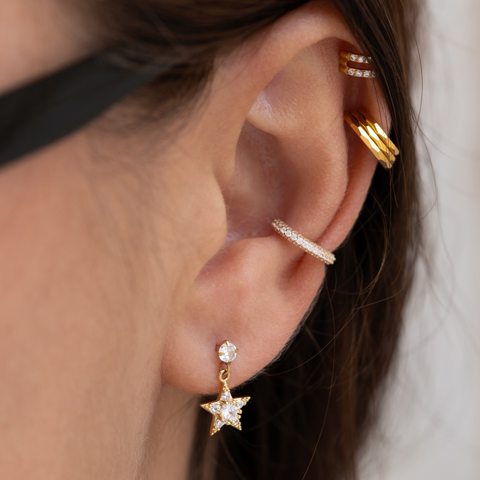 Acest labret cu fir intern are o piatră prețioasă fixată pe bilă și un pandantiv în formă de stea încrustată cu pietre.