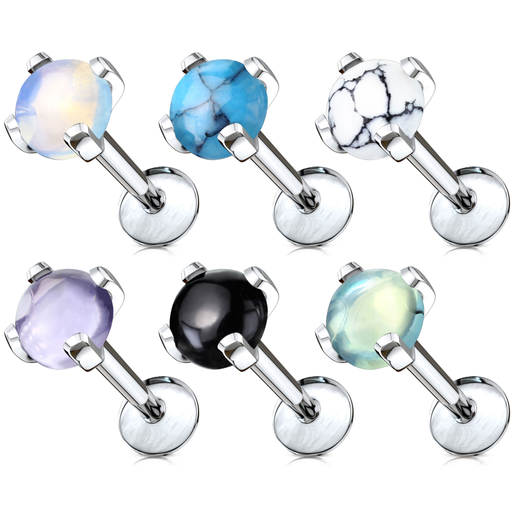 Acest labret are o piatră disponibilă în două variante - jad verde sau howlit alb. Are o lungime de 6 mm ceea ce înseamnă că se potrivește perfect cu piercingurile de buză și multe piercinguri de ureche.