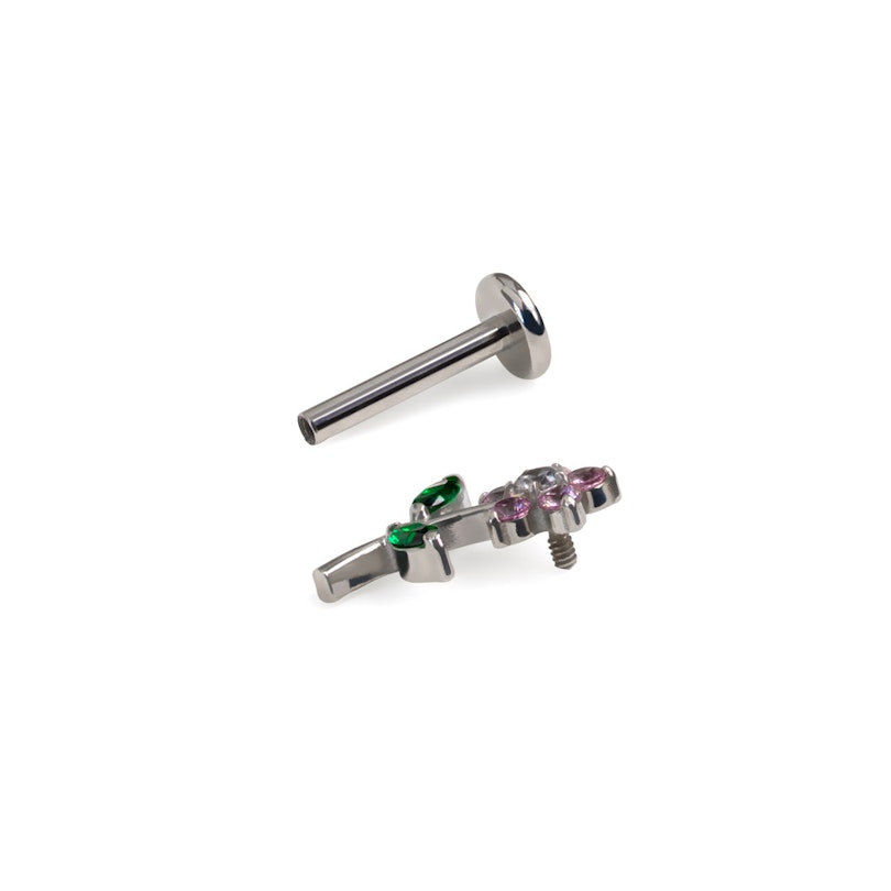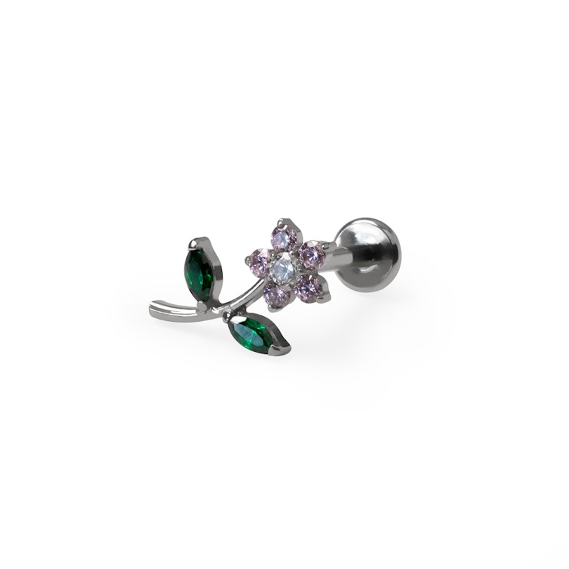 Labretul cu spate plat și floare drăguță aduce un aer de primăvară în colecția ta pentru ureche. O inflorescență fixată în gheruțe cu frunze verzi, combină detaliile jucăușe cu ușurința de purtare zi de zi. Făcut din oțel chirurgical 316L, este durabil, rezistent la apă și prietenos cu majoritatea tipurilor de piele.