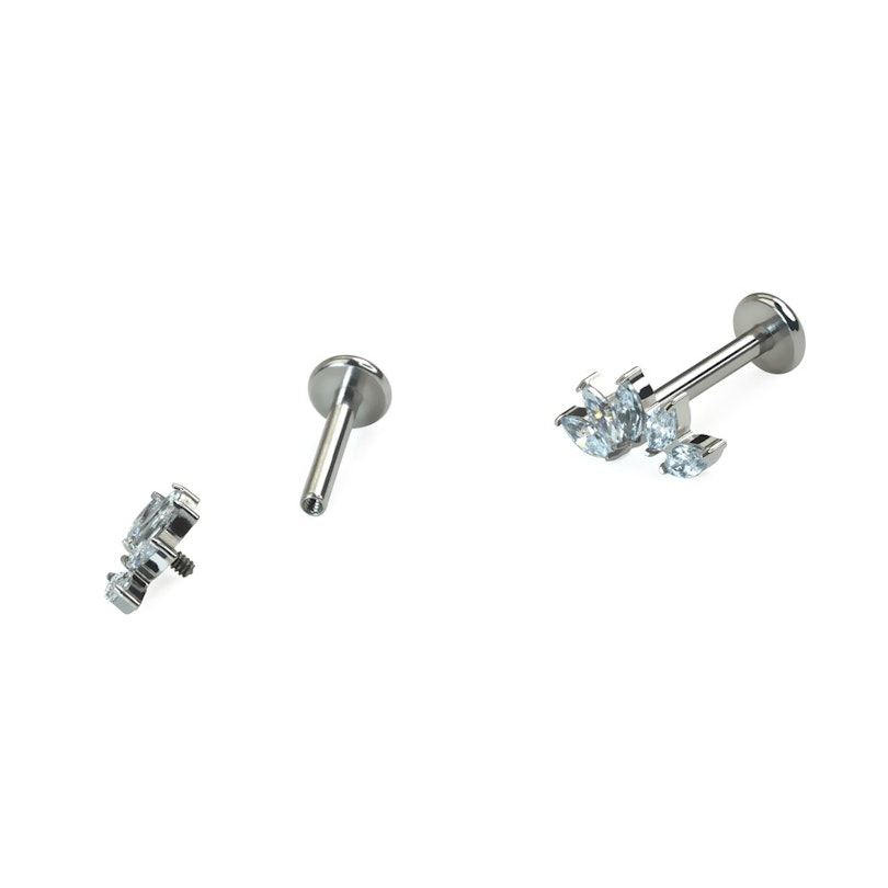 Acest labret din titan are 5 pietre cu tăietură marchiză dispuse într-o linie curbă. Bijuteria are fir intern, așadar, pentru a o purta trebuie doar să inserezi tija fină prin piercing și să înșurubezi vârful. Este realizată din titan, deci confortabil de purtat chiar și de cei cu piele sensibilă.