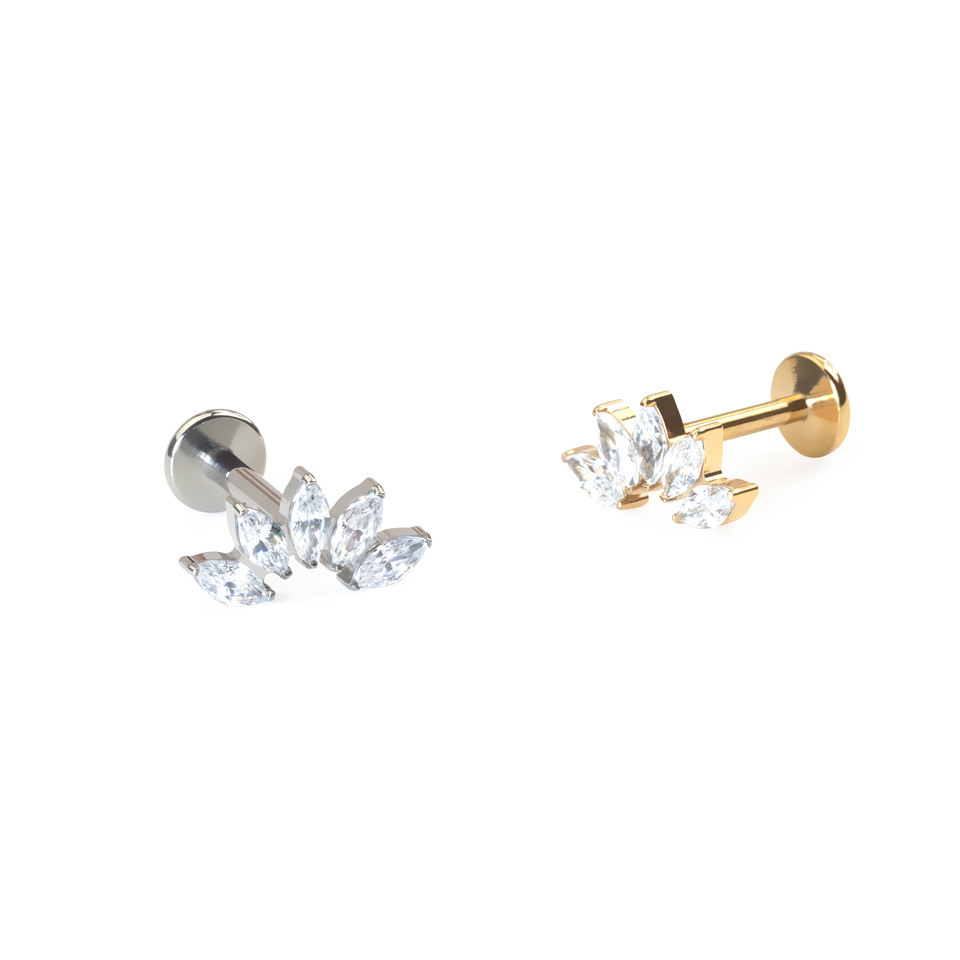 Acest labret din titan are 5 pietre cu tăietură marchiză dispuse într-o linie curbă. Bijuteria are fir intern, așadar, pentru a o purta trebuie doar să inserezi tija fină prin piercing și să înșurubezi vârful. Este realizată din titan, deci confortabil de purtat chiar și de cei cu piele sensibilă.