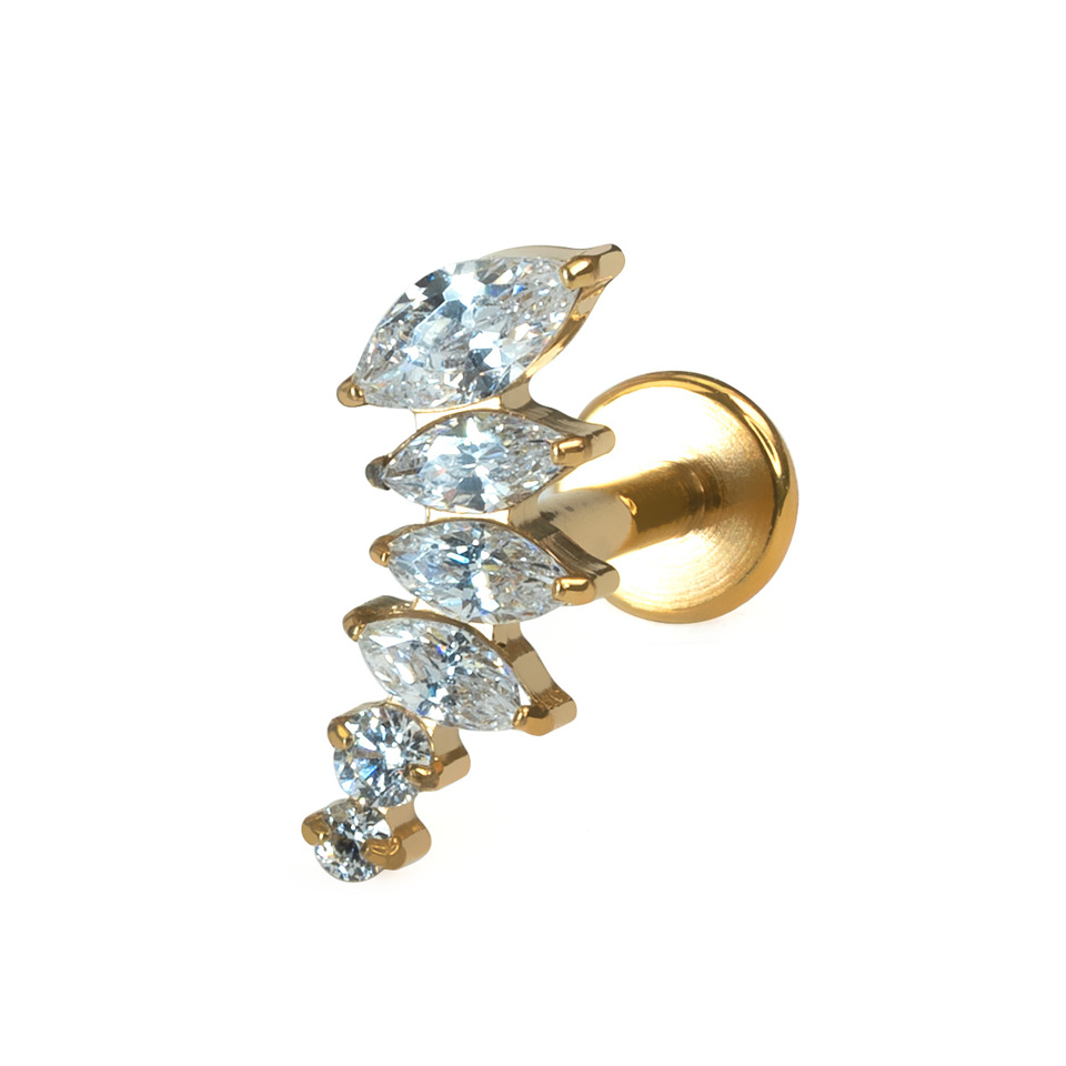 Acest labret are pietre din zirconiu cu tăietură marchiză în mărimi descrescătoare, aranjate într-o curbă discretă, ideal pentru a fi purtat într-un piercing cum ar fi helix, piercing plat sau partea de sus a lobului, unde curba va urma conturul urechii tale. Bijuteria este decorată cu un fir intern, așadar, pentru a o purta, trebuie să inserezi tija fină prin piercing și să înșurubezi vârful pentru a-l fixa. Realizat din titan, cercelul este potrivit pentru persoanele cu piele sensibilă.