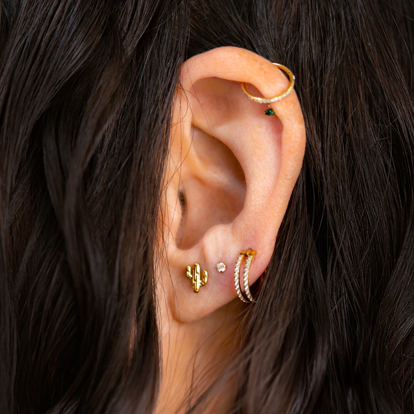 Disponibil în varianta auriu sau argintiu, îl poți strecura cu ușurință în conch, helix lob sau tragus. Purtare zilnică? Bifat. Un super piercing? Bifat de două ori.