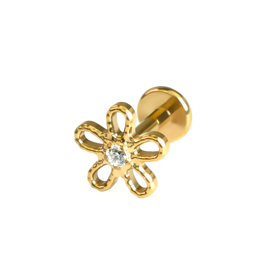 Labretul nostru încântător în formă de margaretă are o piatră centrală din zirconiu pentru un plus de strălucire. Are o tijă cu fir intern, ceea ce-l face ușor de purtat - trebuie doar să treci tija fină prin piercing și să răsucești vârful pentru a-l fixa. Realizat din titan hipoalergenic, este ideal pentru pielea sensibilă. Este disponibil în finisaje auriu și argintiu lucios și în mai multe lungimi, astfel încât să-l poți potrivi cât mai ușor cu piercingul tău. O margaretă drăgălașă pentru lookul tău.