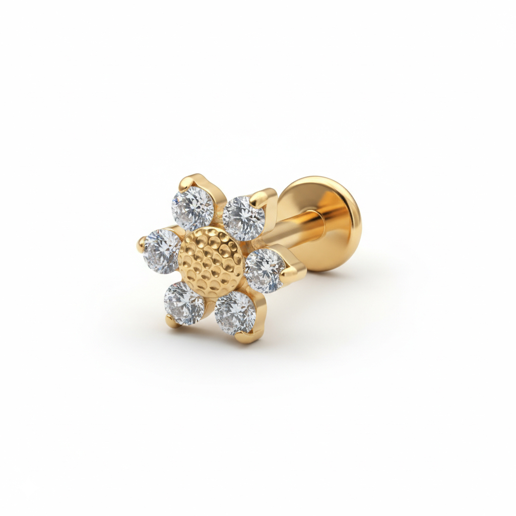 Labretul din titan cu margaretă este un mic reminder că nu toate zilele trebuie să fie serioase. Cu un model cu floare din pietre fixate în gheruțe și un centru texturat, disponibil în variantele auriu și argintiu, aduce un farmec jucăuș exact cât trebuie.
