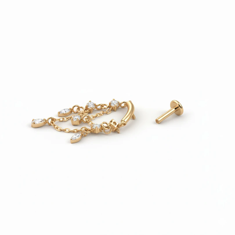 Labretul din titan cu pandantive tip candelabru înseamnă numai mișcare. Mici picături cu pietre încastrate atârnă sub labret, adăugând o mișcare discretă pe care o observi când întorci capul. Are un aer elegant fără să exagereze și e perfect când vrei ceva puțin diferit față de bijuteriile tale de zi cu zi. Disponibil în culorile auriu și argintiu.