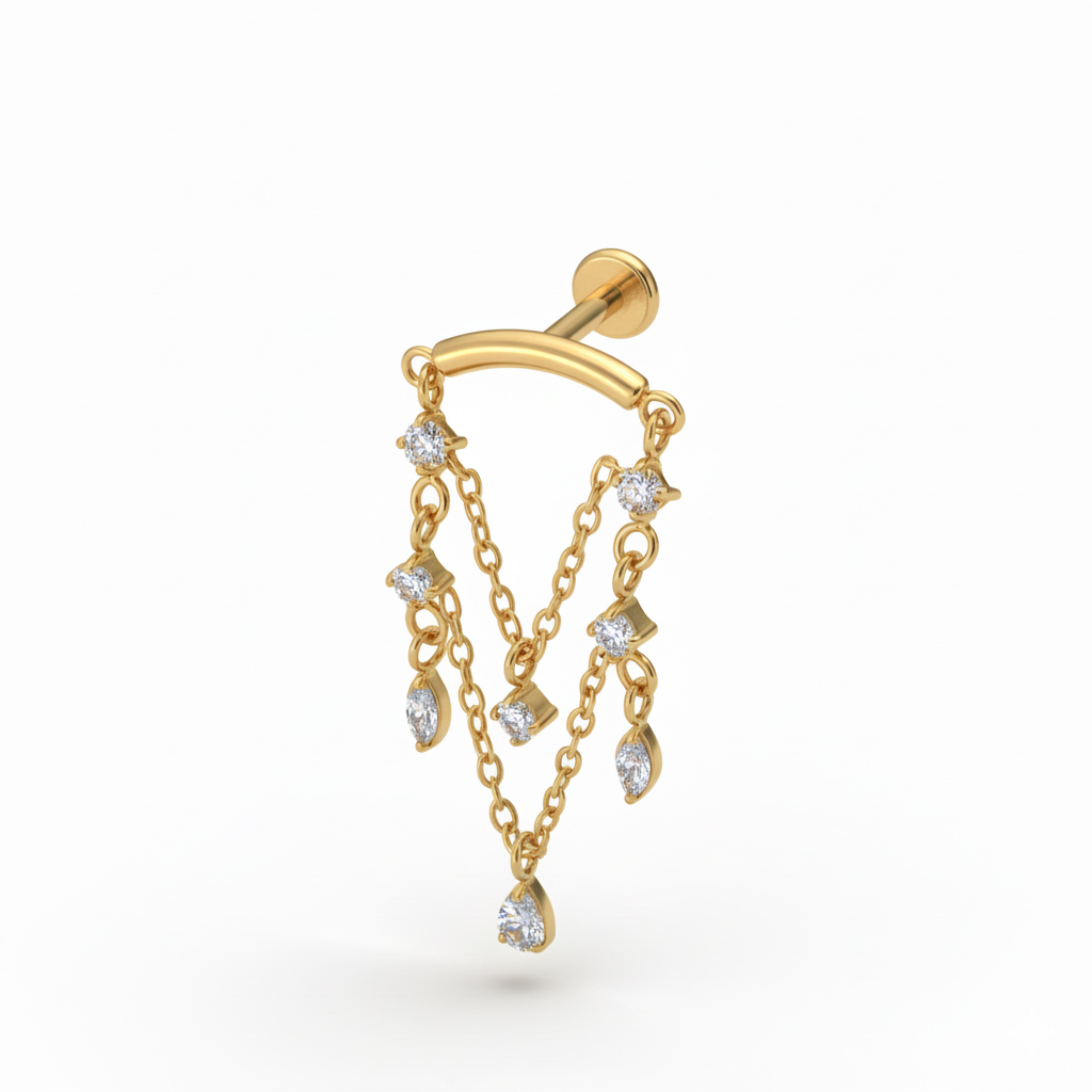 Labretul din titan cu pandantive tip candelabru înseamnă numai mișcare. Mici picături cu pietre încastrate atârnă sub labret, adăugând o mișcare discretă pe care o observi când întorci capul. Are un aer elegant fără să exagereze și e perfect când vrei ceva puțin diferit față de bijuteriile tale de zi cu zi. Disponibil în culorile auriu și argintiu.