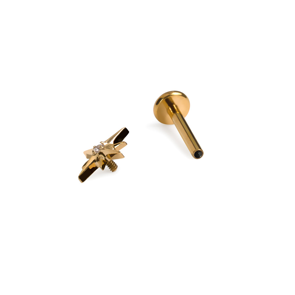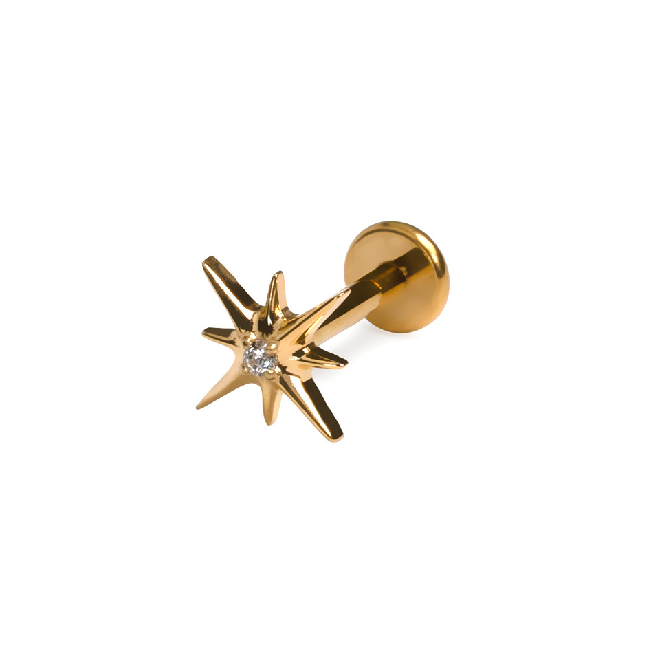 Labretul din titan cu stea și piatră centrală este cei care doresc ca bijuteriile lor să aibă puțin dramatism cosmic. Modelul în formă de stea mărginește o piatră centrală. Disponibilă în finisaje auriu și argintiu, este un detaliu care iese în evidență pentru orice combinație de ureche.