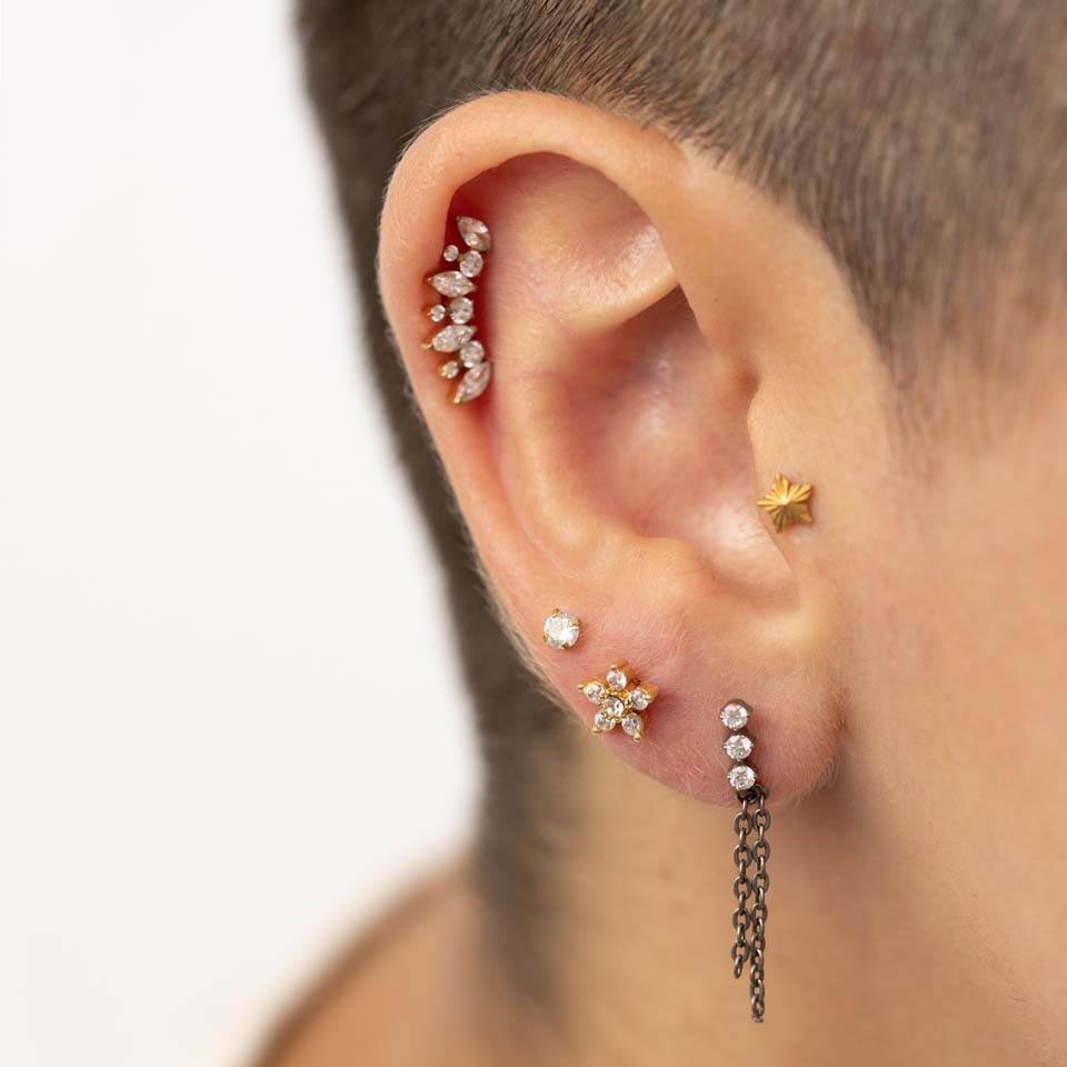 Acest labret stilat are un șir de trei pietre se zirconiu înacastrate cu două pandante sub formă de lanț atașate de o buclă mică la un capăt al lui. Lănțișoarele au mărimi diferite, ceea ce dă un efect asimetric foarte cool. Cel mai lung lanț măsoară 19 mm. Bijuteria poate fi purtată orizontal în lob sau vertical, în unghi, în alte piercinguri de ureche - poartă-l cum vrei pentru un look super.