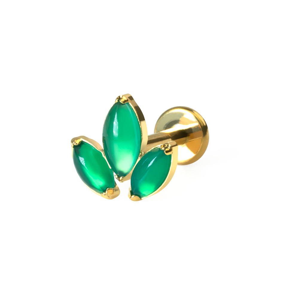 Acest labret stilat are 3 pietre verzi cu tăietură tip marchiză aranjate în model floare de lotus.