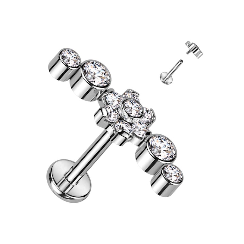 Labretul din imagine este fabricat din titan, unul dintre cele mai durabile și recomandate materiale pentru piercinguri. Este filetat interior, adică are un fir intern. Vârful are o tijă filetată înșurubată în suport, pentru a evita zgârierea atunci când inserezi labretul în piercing.