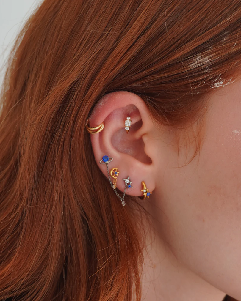 Setul spațial de labret din titan se joacă cu ideea de conexiune și mișcare. Un labret are forma unei mici planete, celălalt e împodobit cu steluțe minuscule, legate între ele printr-un lanțișor fin cu o piatră mică atârnând în centru. Pietrele din zirconiu cubic, transparente și albastre, adaugă un contrast subtil, păstrând lookul aerisit și puțin cosmic fără a exagera. Are un finisaj argintiu și e gândit să fie purtat în pereche.