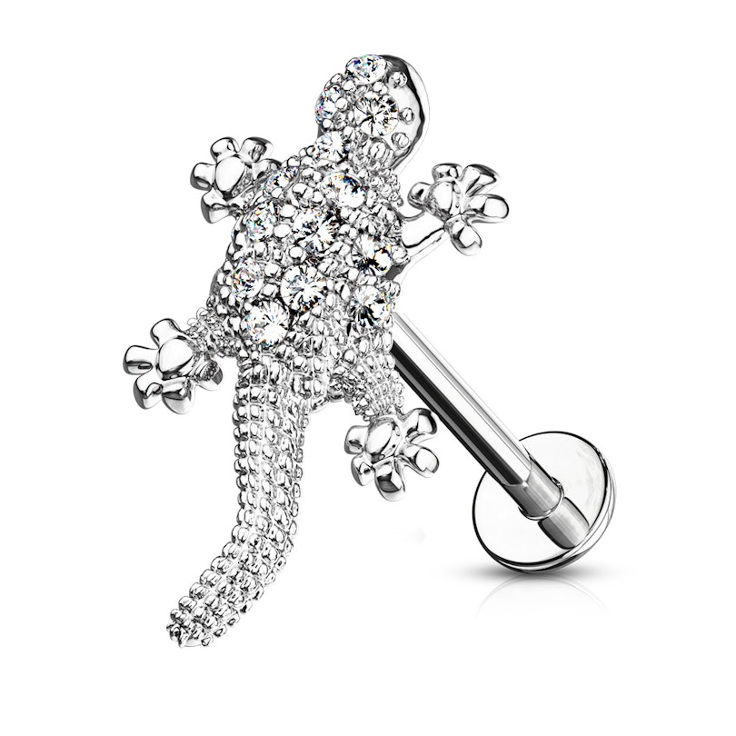 Labretului pe care ți-l prezentăm aici este făcut din oțel chirurgical, și mai are și o frumoasă șopârlă în partea din față făcută din alamă. Toată piesa este suflată cu diferite culori din care poți alege; modelele cele mai ieșite din comun sunt cele din aur roz și aur galben. În spatele șopârlei, multe mici pietre transparente adaugă bling animalului drăguț - aceste pietre sunt transparente în toate modelele, indiferent de culoarea pe care o selectezi.