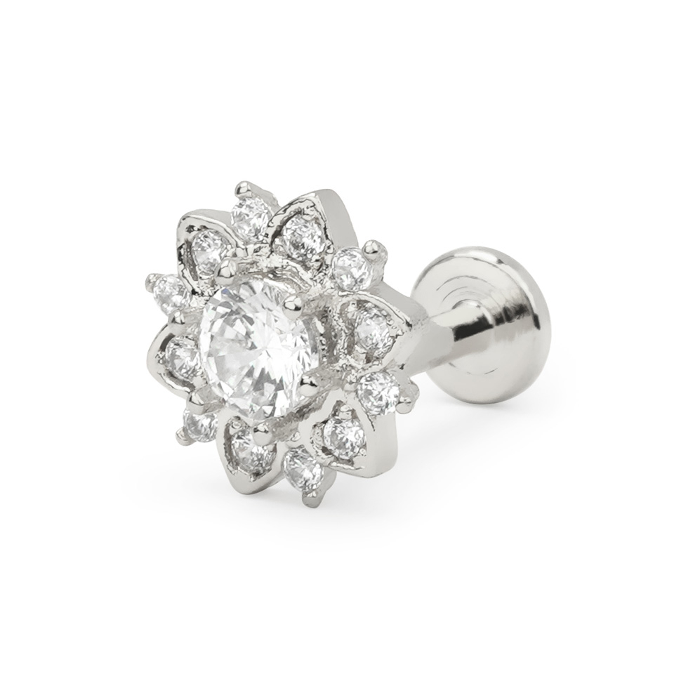 Modelul vârfului rerezintă o frumoasă floare de lotus din alamă. Întreaga bijuterie este suflată cu diferite culori din care poți alege: aur, aur roz și argintiu. Floarea de lotus măsoară 8 mm în total și este decorată cu multiple pietre mici și transparente pe margine, și o piatră fațetată în mijloc. Piatra din mijloc măsoară 3.5 mm.