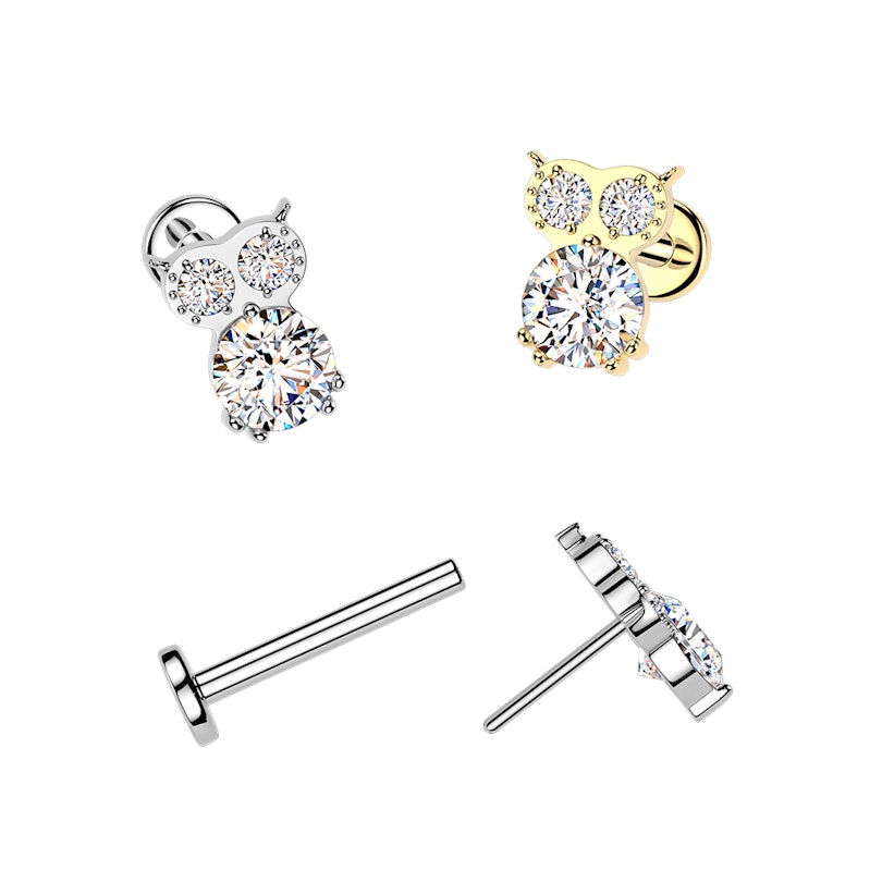 Labretul din titan în formă de bufniță, cu pietre, adaugă un strop de personalitate combinației tale de ureche. Forma bufniței e detaliată cu mai multe pietre prinse într-o montură cu gheare ordonată, dând designului textură fără să pară încărcat. Disponibil în culorile auriu și argintiu, se potrivește perfect când vrei ceva cu formă și expresiv, nu minimal.