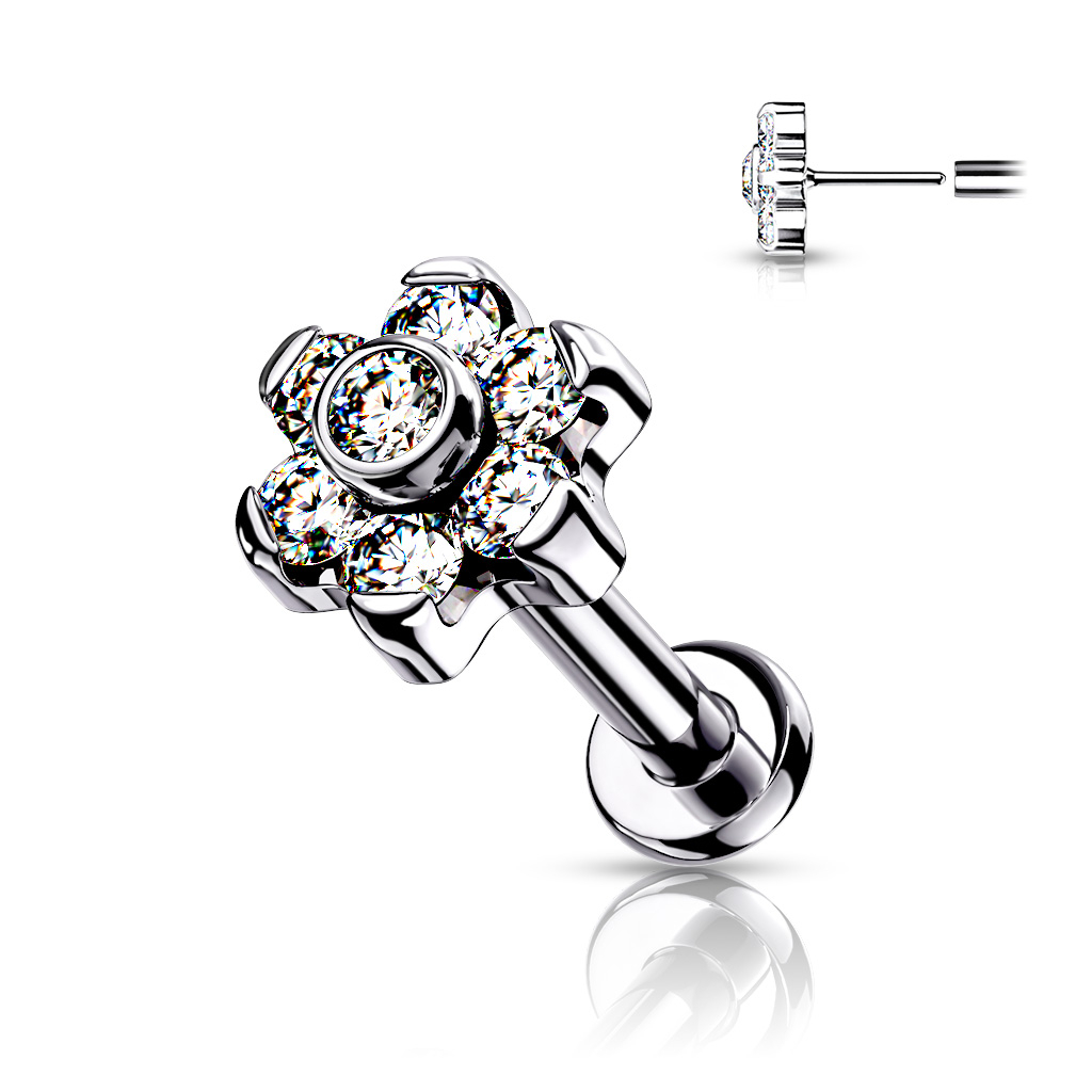Partea superioară a labretului are șapte pietricele așezate în formă de floare -- o floare frumoasă cu șase petale și o piatră la mijloc. Îți poți alege singur culoarea pietrelor. Un pin mic este montat pe spatele florii, ca o mică încuietoare. Poți să tragi pur și simplu pinul din bară, să introduci bara în piercing și apoi să apeși din nou pinul în bară. Pinul va sta în tensiune în interiorul barei. Dacă îl scoți de câteva ori și apoi îl pui la loc, vei vedea că se deschide din ce în ce mai ușor. Nu-ți face griji! Poți să rezolvi asta introducând jumătatea de sus în bară și întorcându-l ușor. Asta va mări din nou tensiunea pinului în bară.