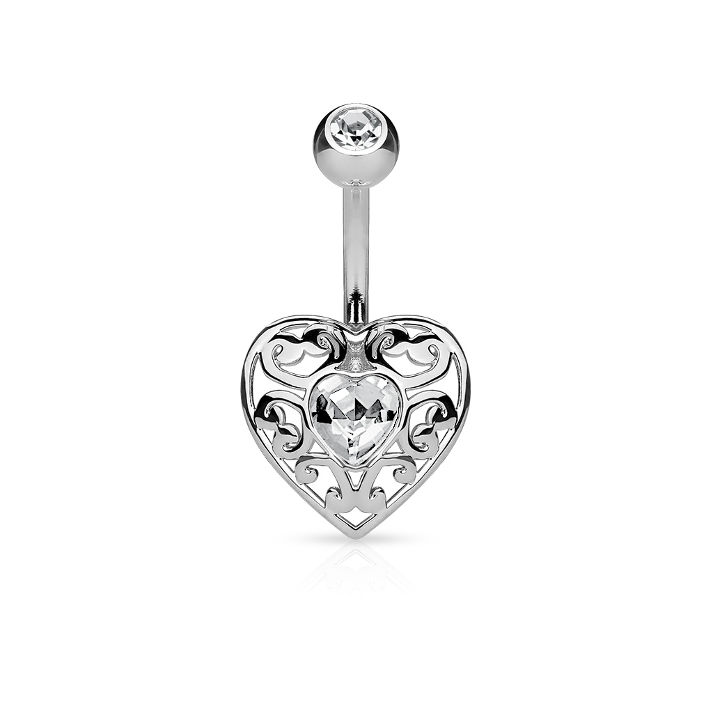 Capătul de jos este un pandantiv inimă facut din alamă și tija curbată care pătrunde prin piercing-ul tău este facută din oțel chirurgical. În centru inimii este o piatră tot în formă de inimă, și este disponibilă în diferite culori depinzand de nuanța tijei pe care o vei avea.