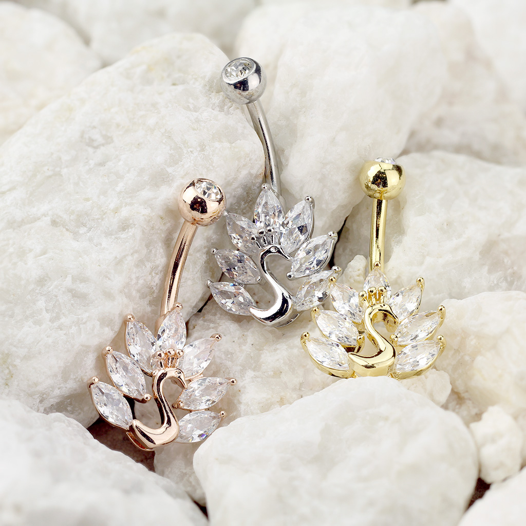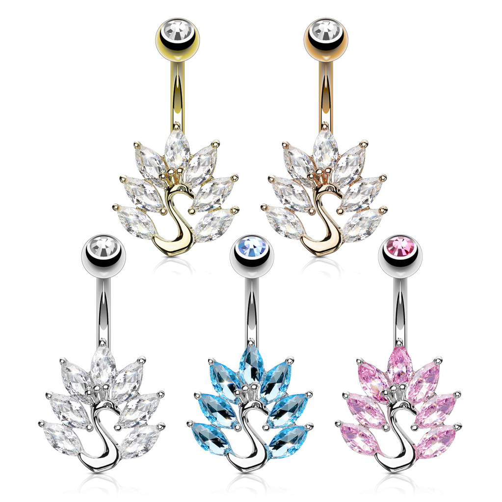 Cercelul de buric la care te uiți are un păun. Păunul are pietre tăiate marchiz formând penele cozii sale, ce sunt parte dinntr-un ritual sexual ce implică lupta, unde masculii se intimidează între ei pentru a impresiona femela. În mod normal, un păun mascul are între 100 și 150 pene pe coadă.