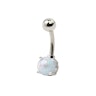 Acest cercel de buric din oțel chirurgical are un opal alb fixat în gheruțe.