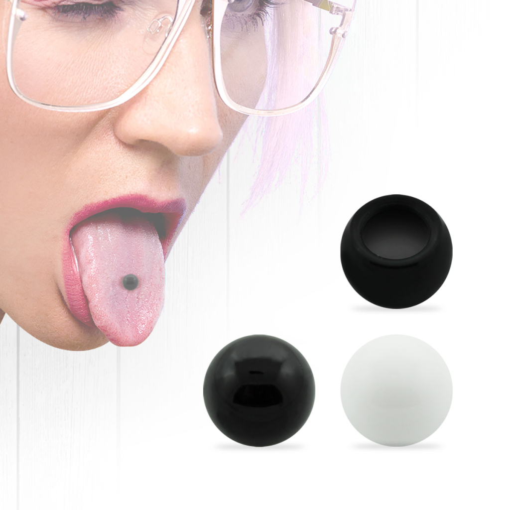 Îți prezentăm un cercel pentru limbă fals, ceea ce însemană că nu trebuie să ai o gaură în limbă ca să-l porți. Cu acest cercel fals pentru limbă vei vedea și simți cum este să ai un piercing în limbă. Este disponibil în două culori diferite: alb și negru. Bila este făcută din acril, dar nu este o bilă ci o jumătate de sferă cu un gol în interior. Golul permite unui vacum să fie creat ca bijuteria să rămână pe limba ta și să arate ca un piercing real.
