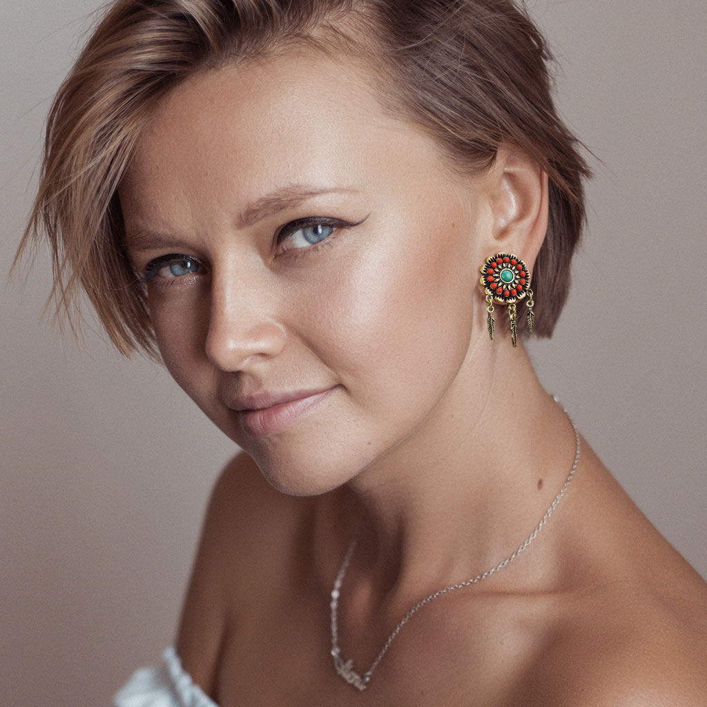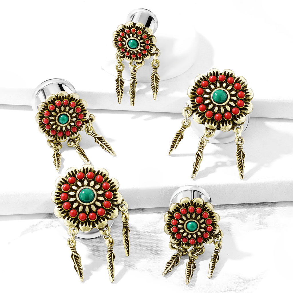 Plugul prezintă partea din față decorativă care arată ca o floare. Floarea are o mărgea din turcuaz din acril în centru care se potrivește cu mărgelele roșii din jurul său frumos. În jurul marginii plug-ului, o ramă consistă în mici frunze care fac floarea să iasă în evidență. Nu doar este o floare cu multe detalii, ci și un plug care include trei pene care atârnă liber și vor lua urma mișcările corpului tău.