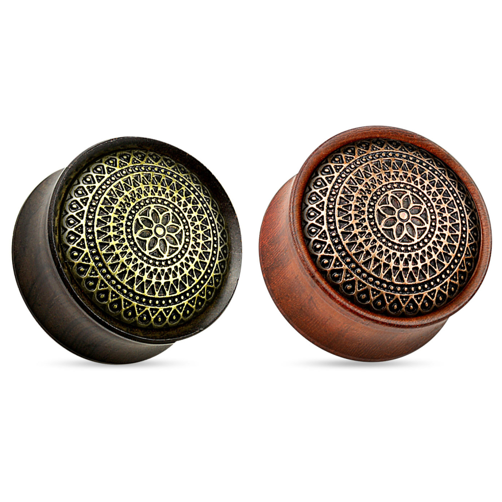 Materialul organic precum lemnul permite pielii din piercing să respire chiar și când porți bijuteria, și chiar previne mirosurile neplăcute. Acest plug este disponibil în două tipuri de lemn. Alege dintre lemn de culoare roșiatică sau culoarea închisă a abanosului. Partea din față a plug-ului este făcut din alamă: în modelul din lemn roșu, alama are culoarea cuprului, în timp ce modelul din abanos are culoarea alamei. Ambele modele sunt în contrast cu culoarea naturală a lemnului. Modelul auriu peste plug-ul negru oferă bijuteriei un look foarte vechi, în timp ce lemnul roșiatic armonizează cu motivul din alamă.