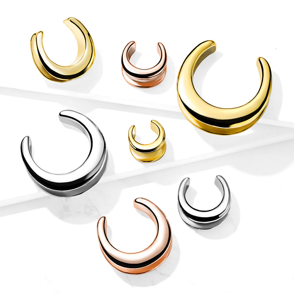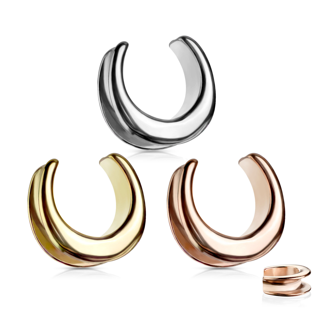 Bijuteria pe care o vezi aici este puțin mai greu de categorizat. Este numit saddle spreader, care nu este nici tunel, nici plug și nici hanger. Nu este nici taper. Cel mai apropiat este poate de un tunel, cum poți vedea prin el. Dar acesta este deschis în vârf, ceea ce are avantajul că îl poți purta când gaura din ureche este mai mare decât diametrul bijuteriei. Marginile spreader-ului se ondulează în interior, făcându-l să-ți încercuiască stretching-ul lobului urechii. Așadar, chiar dacă este mai mic decât gaura urechii, bijuteria nu-ți va scăpa.
