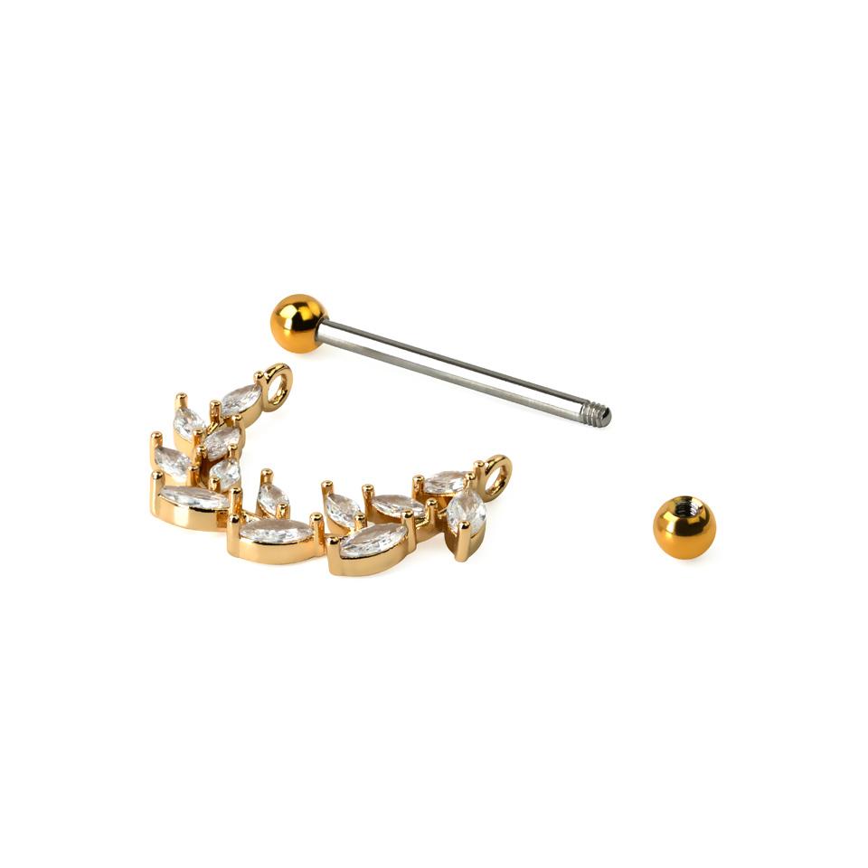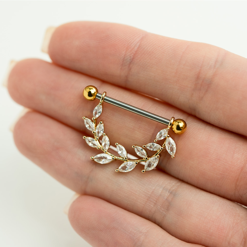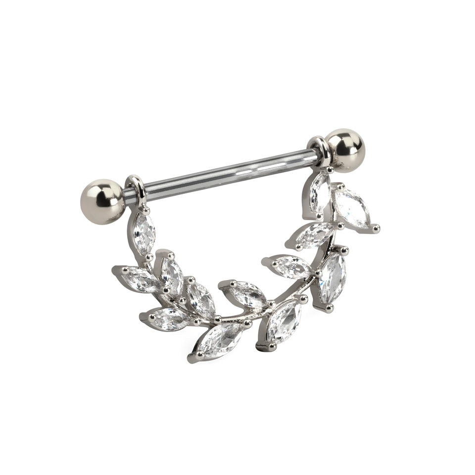 Acest scut de sfârc este perfect pentru tine dacă vrei un design unic. Acest scut de sfârc consistă într-o bară dreaptă cu o bilă la fiecare capăt. Ambele bile pot fi înșurubate și deșurubate și pot fi înlocuite dacă dorești. De bară atârnă o frumoasă frunză cu pietre mici alungite.