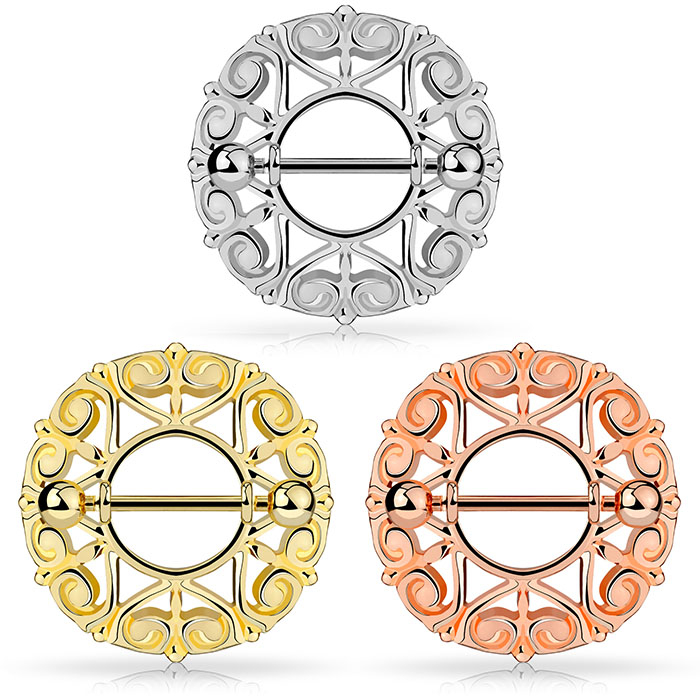 Poți alege dintre trei culori: argintiu, auriu sau auriu roze. Toate trei modelele sunt de primă clasă, perfecte pentru piercing-ul de sân.