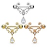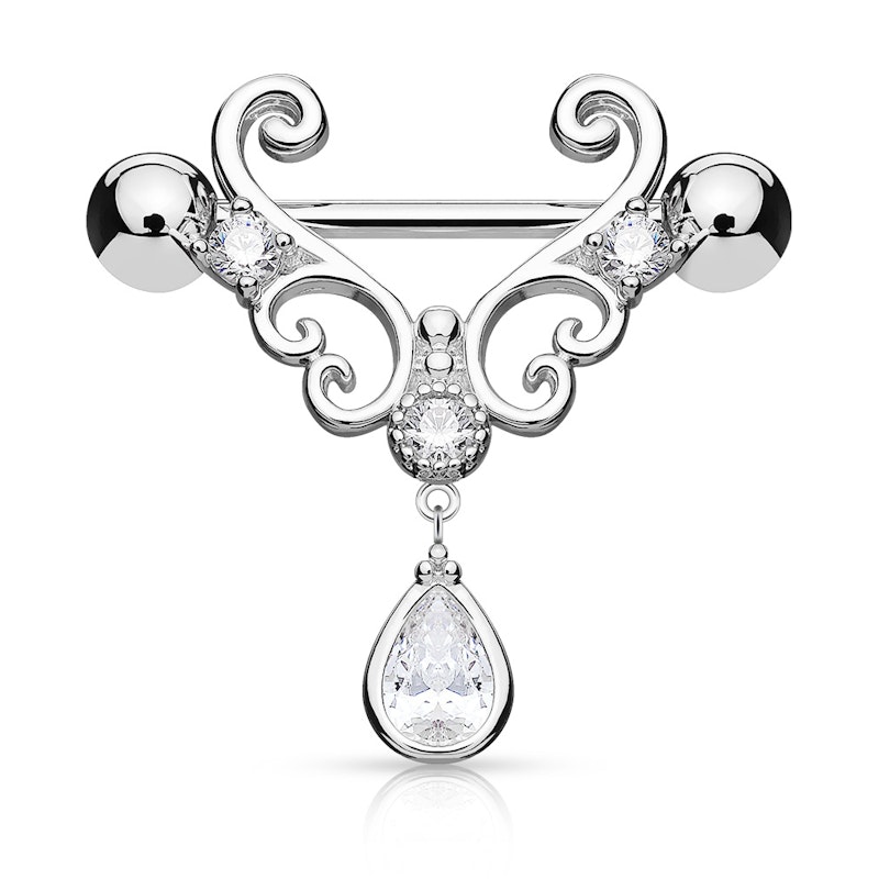 Dacă tu crezi că scutul de sfârc în poză este frumos, crede-ne, arată incredibil în piercing-ul tău de sfârc. Forma drăguță a acestui scut înrămează sfârcul impresionant. Are un total de 4 pietre; două pe fiecae parte și unul în mijloc; și ultima piatră, în formă de picătură, atârnă de cea din mijloc. În plus, bijuteria are o inimă și forme valurite prin scut, creând o tijă de sfârc excepțională.