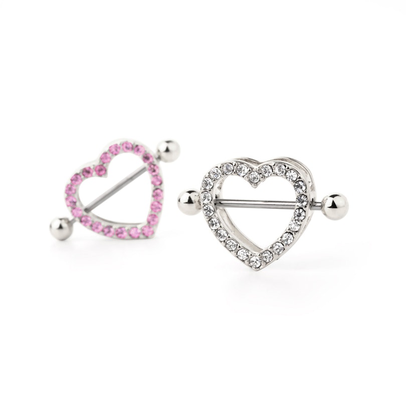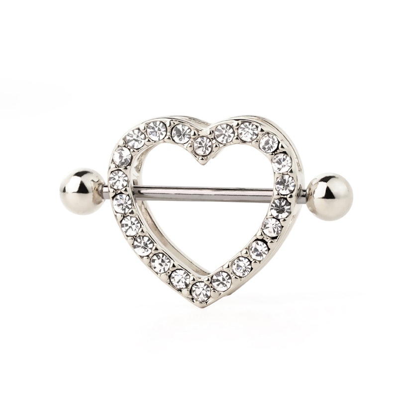 Acest scut de sân este perfect pentru tine dacă ai o inimă bună ;-) Este un scut de sfân incredibil de feminin cu două profile în formă de inimă. Cea din partea de sus este decorată cu pietre mici în formă de diamant. Cele două inimi sunt pune una în fața celeilalte, separate de un pic de spațiu. Acesta aparține barei drepte ce trece prin piercing-ul tău de sfârc. Acest scut va face sfârcul tău să arate super sexy chiar mai mult decât este deja.