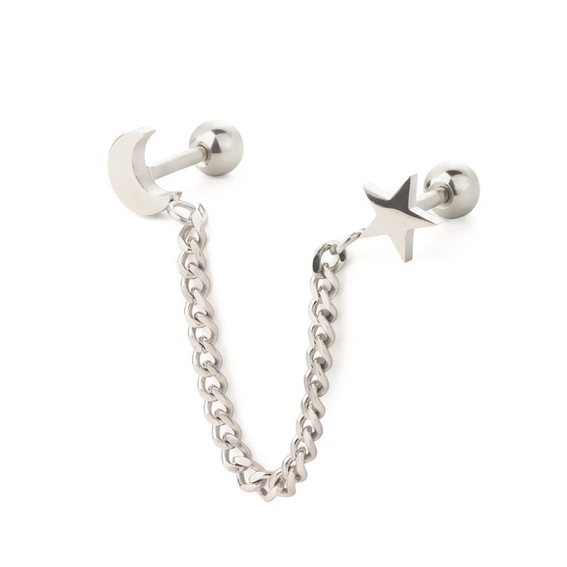Bijuteria este formată din două bare conectate cu un lanț. Fiecare bară are o grosime de 16g (1.2 mm) și o lungime de 6 mm. Are o bilă de închidere de 4 mm în partea din spate. În partea din față, are o stea și o semilună.
