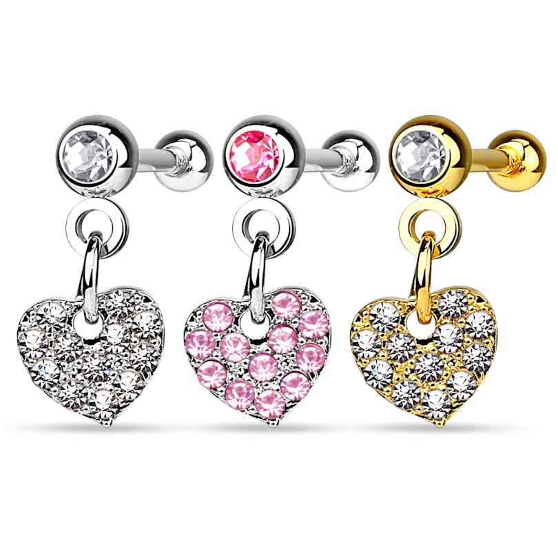 Acest stud are o bilă cu piatră de care este agățat un pandantiv superb. Pandantivul are o inimioară superbă, acoperită complet de pietre strălucitoare. pietrele au o tăietură asemănătoare diamantelor pentru ca lumina să se reflecte în ele din fiecare unghi.