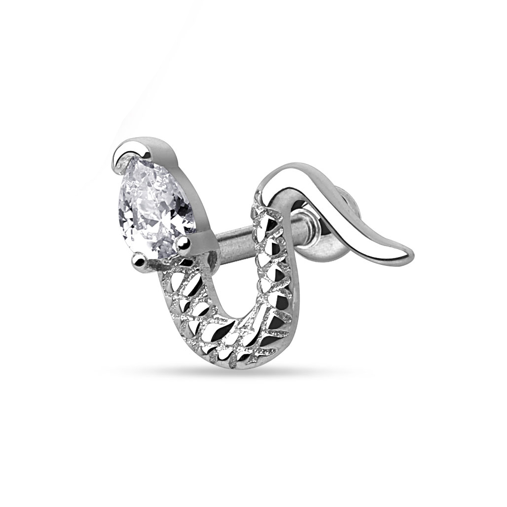 Acest stud frumos în formă de șarpe are mărimea potrivită pentru oricare dintre piercing-urile de tragus, helix sau lobul urechii.