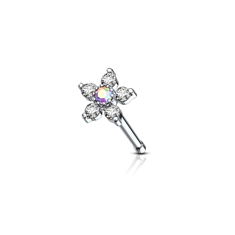 Bara de top prezintă o floare decorată. Floarea este de aproximativ 1/4 inches (6.5 mm) în diametru. Petalele sunt mici cristale grupate împreună. Ne mai contând culoarea pe care o alegi pentru bară și piatră, pietrele petale vor fi întotdeauna trasnparente.