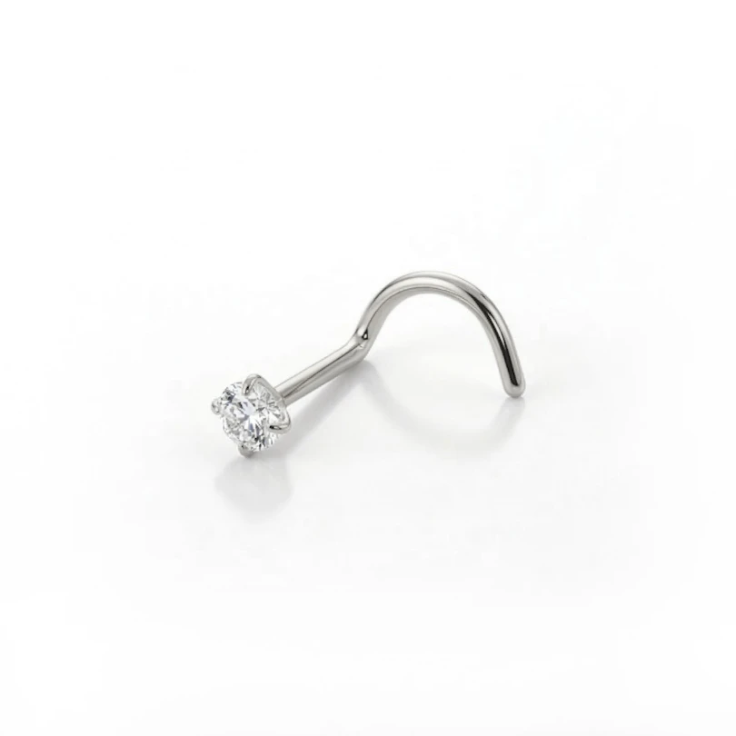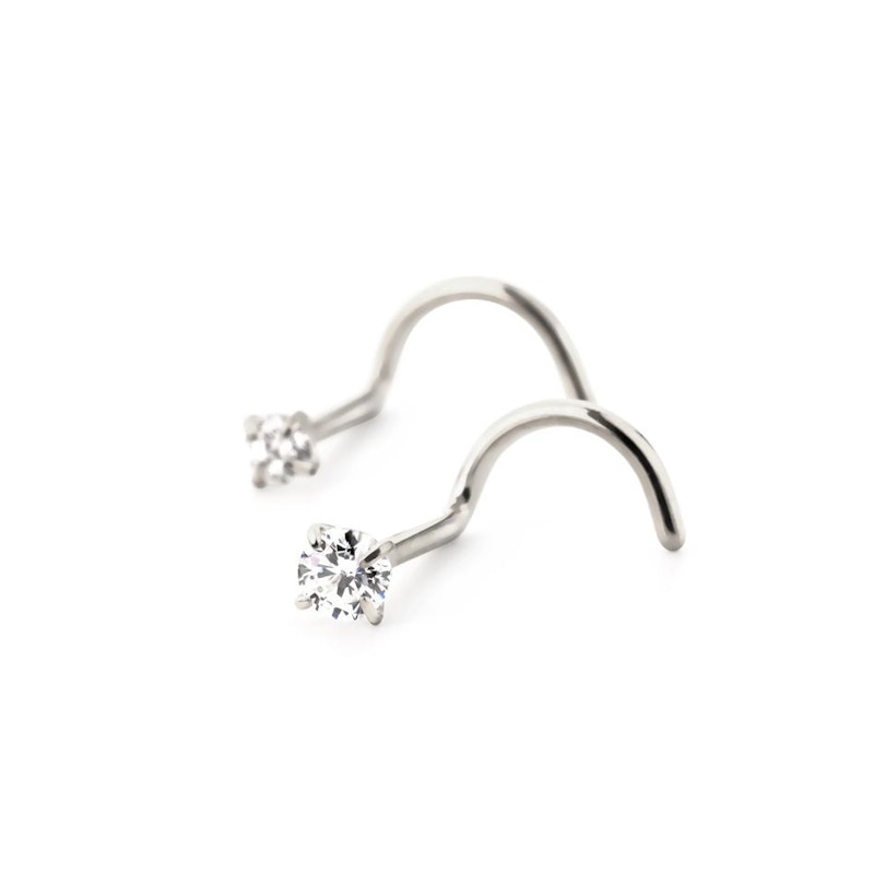 Poți alege între o grosime de 20g (0.8 mm) sau 18g (1 mm), în funcție de ce metodă a fost folosită să-ți faci piercing-ul de nas. Ar trebui să decizi dacă vrei o piatră transparentă de 2 mm sau una de 2.5 mm în diametru. Piatra este securizată de patru mici gheruțe care nu-i permit să cadă. Nu au fost folosiți adezivi pentru a fixa piatra transparentă.