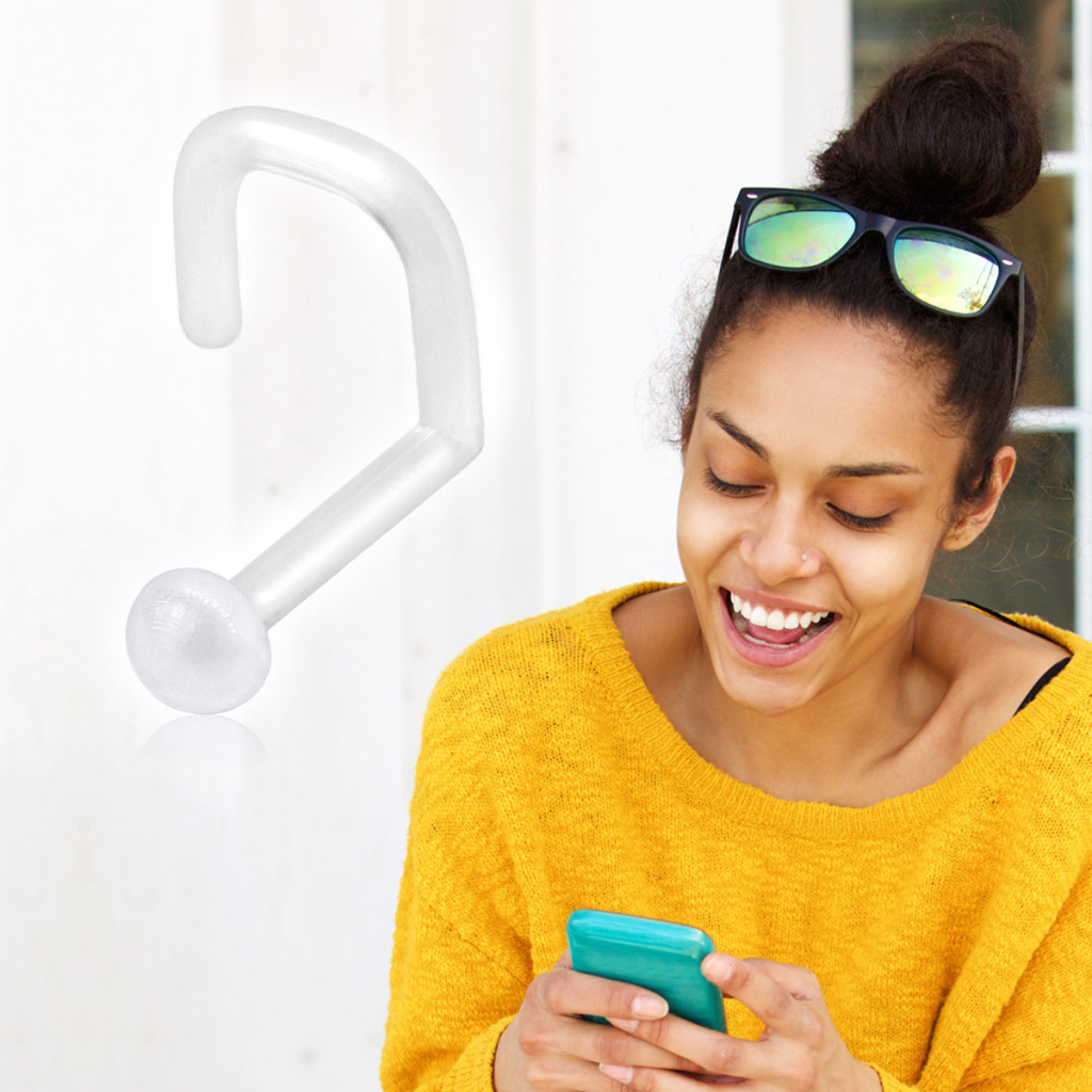 Acest șurub pentru piercing-ul nazal este făcut din PTFE. Acestea mai sunt denumite și ”opritoare” și sunt transparente ceea ce le fac excelente ca ”piesă de lucru” - o bijuterie pe care o poți purta dacă nu ai voie cu piercing-uri la locul de muncă, la școală sau acasă la masa cu bunica.