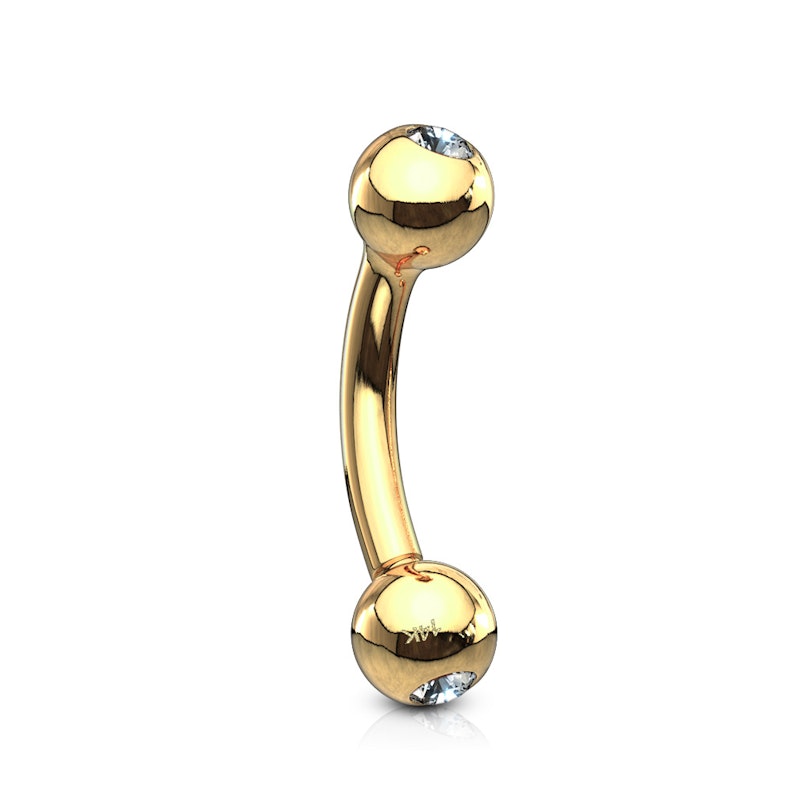 Tijă curbată frumoasă și feminină din aur de 14 carate, cu o piatră transparentă și strălucitoare în ambele bile montate la capete. Această tijă este perfectă pentru cei care caută aspectul clasic atemporal, cu o notă discretă de eleganță grațioasă. Tija de aici este ca o fată tânără și umilă care își arată frumusețea spre lume cu modestie - mai degrabă decât să se comporte ca o prințesă pop. Este discretă, atemporală și feminină într-un mod foarte rafinat. Tija este disponibilă în două lungimi diferite, care pot fi alese înainte de plasarea produsului în coș.