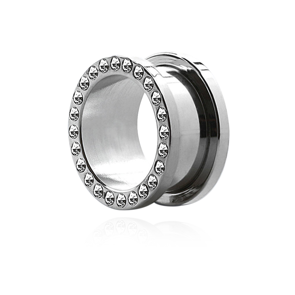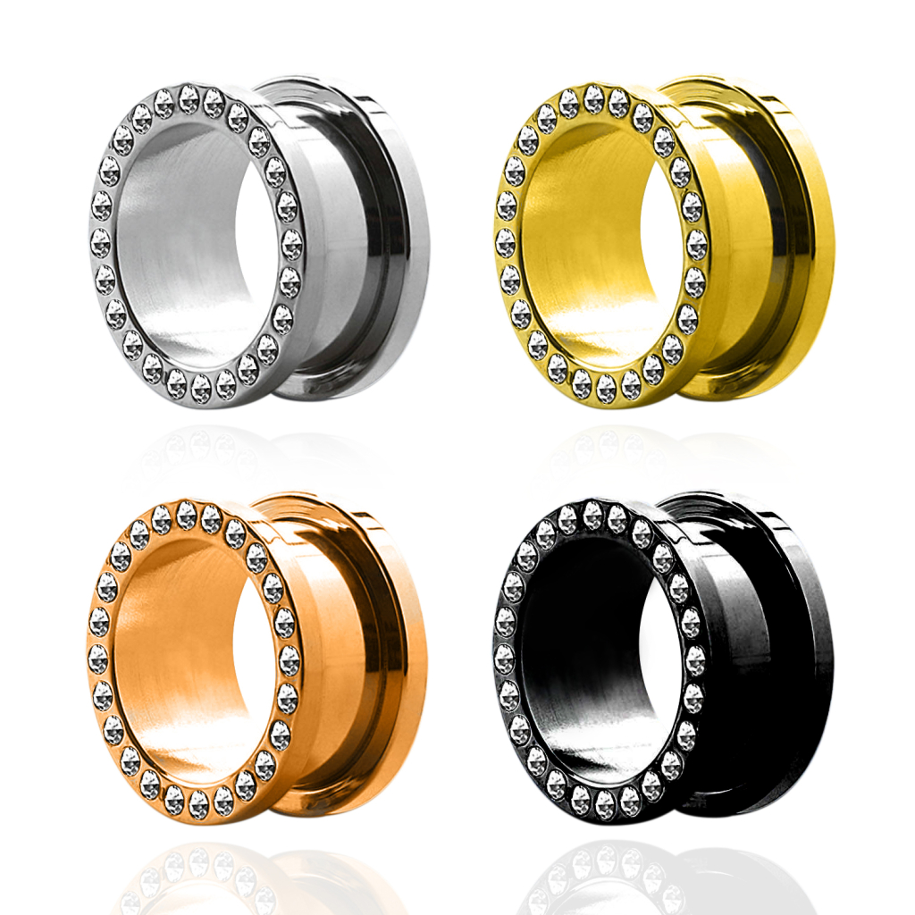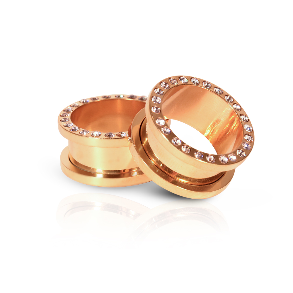Tunelul este făcut din oțel chirurgical, și modele au fost suflate cu diferite metale ce dau multiplele culori din care poți alege. Tu poți, de exemplu, să-l cumperi în culoarea neagră sau aurie. Vine la pachet cu un filet pentru o inserare ușoară; deșurubează spatele, glisează tunelul în ureche și înșurubează-l la loc. Ne contând ce culoare alegi, designul este la fel în fiecare piesă. Tunelul este decorat în întregime pe margine cu multiple pietre de zirconiu și niște sclipici. Aceste pietre sunt lipite, deci aisigură-te că baia nu este o idee bună. Apa caldă poate dilua lipiciul, cauzând căderea pietrelor. Dar știm că ești inteligentă