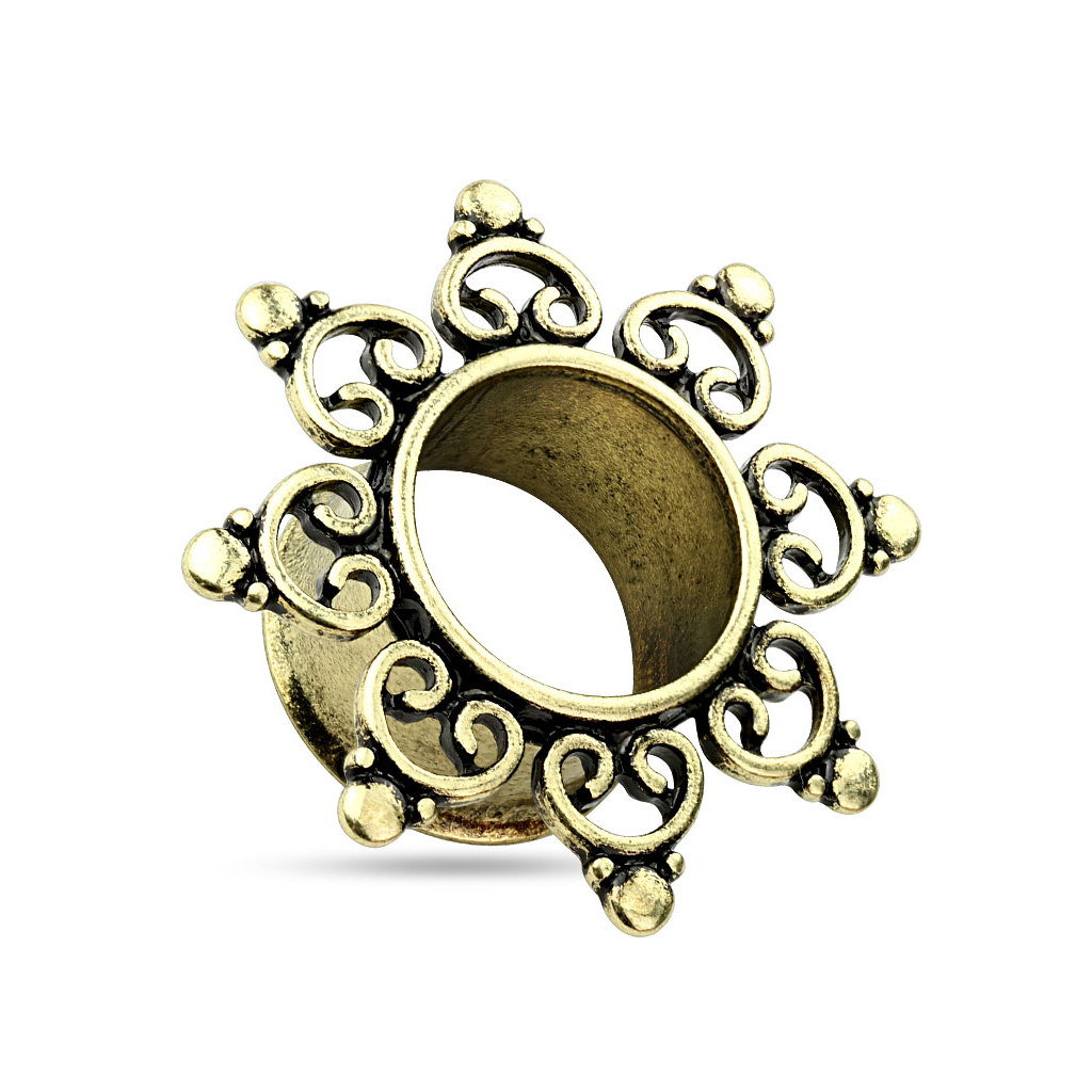 Nu rata șansa de a cumpăra un tunel cu un design unic. Acest tunel fabulos are pe margine un model tribal frumos. Când îl inserezi, tribalul stă pe marginea părții din față a lobului urechii, asemănându-se cu un mic soare cu gaura expanderului în centru. Tunelul este făcut din oțel chirurgical suflat ce îi oferă un aspect de aur antichizat. Tribalul este făcut din alamă, ceea ce se potrivește cu aspectul antichizat. Este disponibil în mărimi începând de la 00g (10 mm) și cu cât este mai mare modelul, cu atât este mai mare modelul tribal, păstrând proporțiile, cu mai mult spațiu între răsuciri.