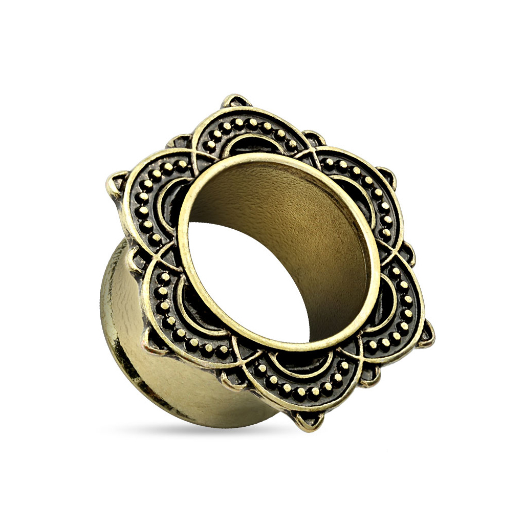 Dacă ești în căutarea unei piese unice, o bijuterie, vei iubi acest tunel. Este făcut din oțel chirurgical și a trecut printr-un proces de placare ca să-l faci să arate ca aur antic. Marginea părții din față prezintă un frumos trandafir Sharon făcut din alamă.