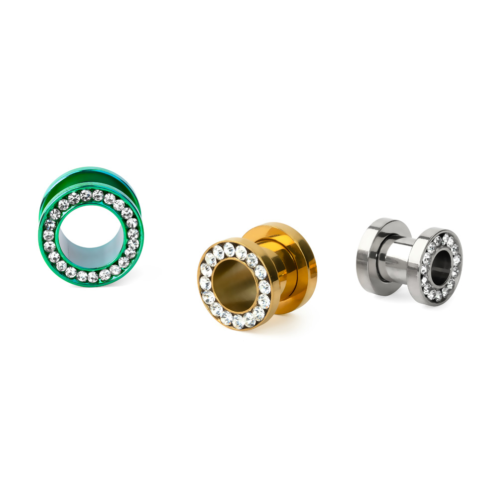 Tunel clasic din oțel chirurgical în diferite culori și mărimi la alegere. Toate modele au multe pietre frumoase decorate una lângă cealaltă pe întreaga margine. Tunelul este disponibil în diferite mărimi care se potrivesc aproape în fiecare lob de ureche.