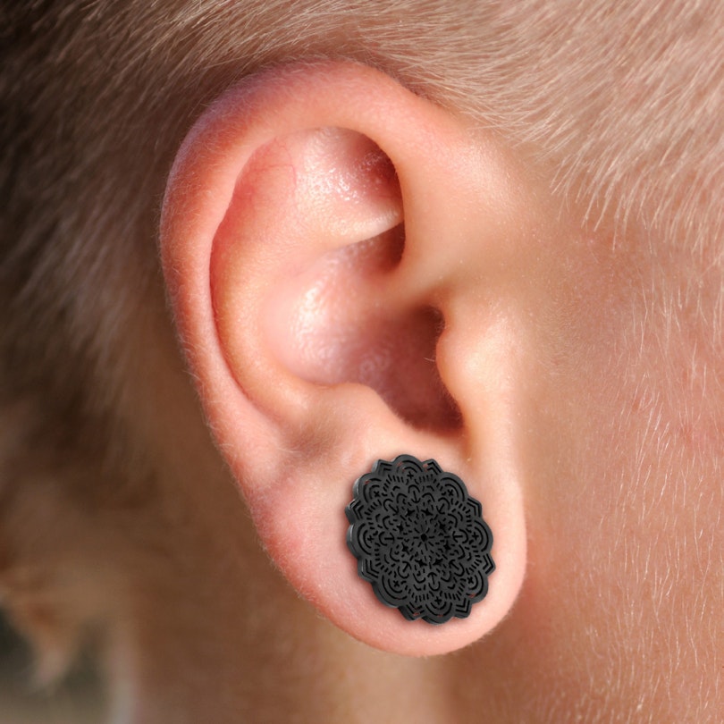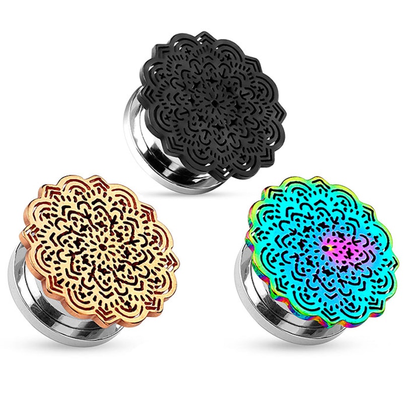 Poți alege dintre această frumoasă și detaliată mandală din diferite culori, clasice sau vibrante. Când tunelul este în lobul urechii, mandala va fi singura parte vizibilă. Spatele este făcut din oțel chirurgical care poate fi deșurubat pentru o inserție și extracție ușoară. Acest tunel fabulos este disponibil în diferite mărimi, deci alege-l pe cel care se potrivește găurii din urechea ta înainte de a-l adăuga coșului tău de cumpărături și apoi finalizează cumpărăturile.