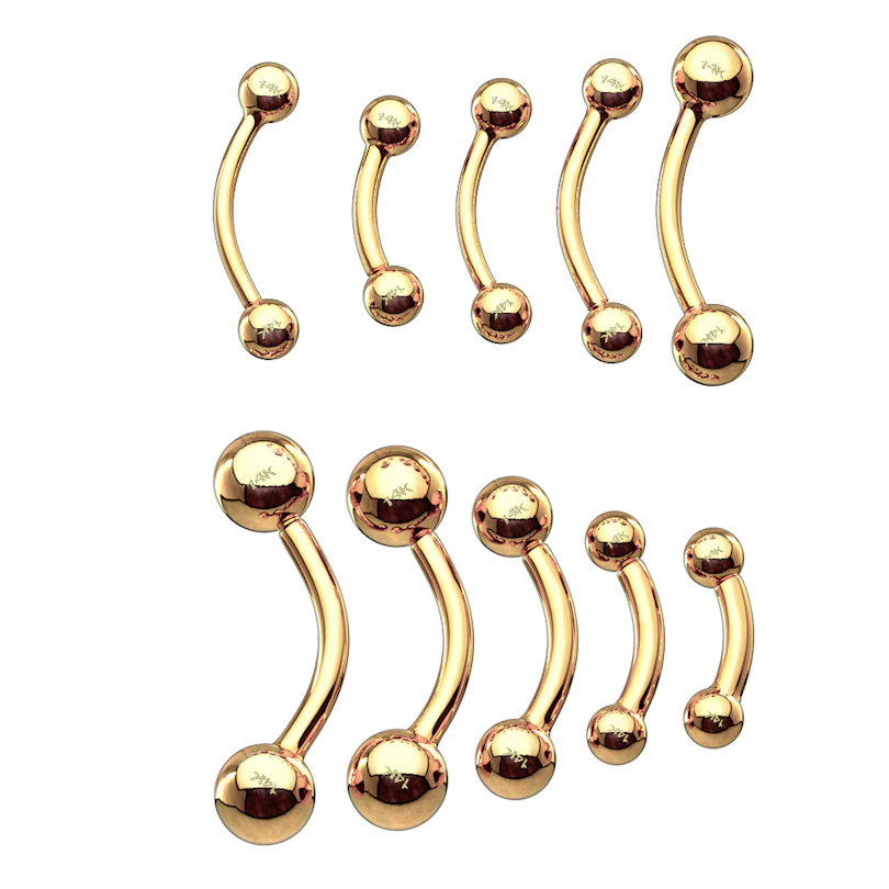 Bară de lux elegantă, în designul curbat cunoscut și pe care deja îl cunoști, dar care este fabricată din aur autentic de 14 carate. Designul în sine este la fel de simplu și multifuncțional ca la toate tijele curbate și poți alege atât grosimea cât și lungimea, și dimensiunea bilelor.