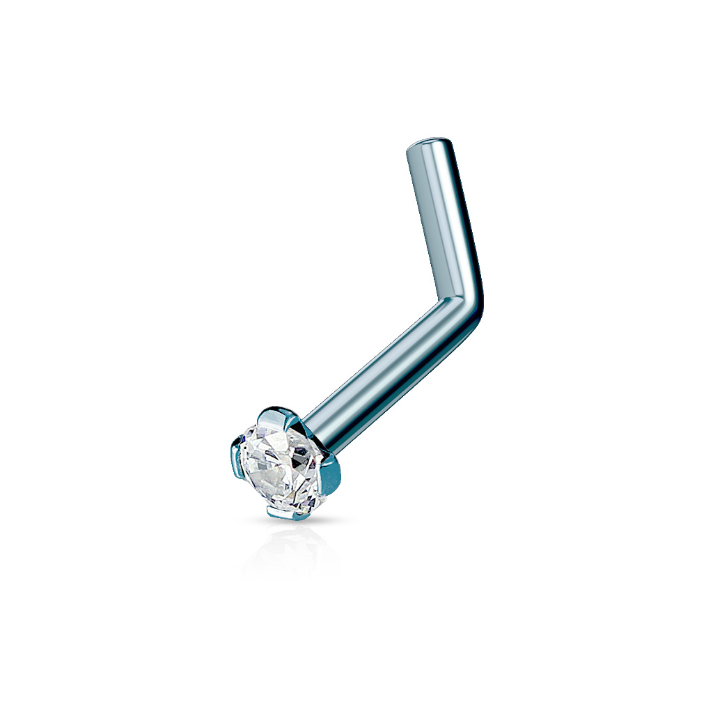 Acest cercel de nas prezintă o piatră transparentă ținută de gheruțe.