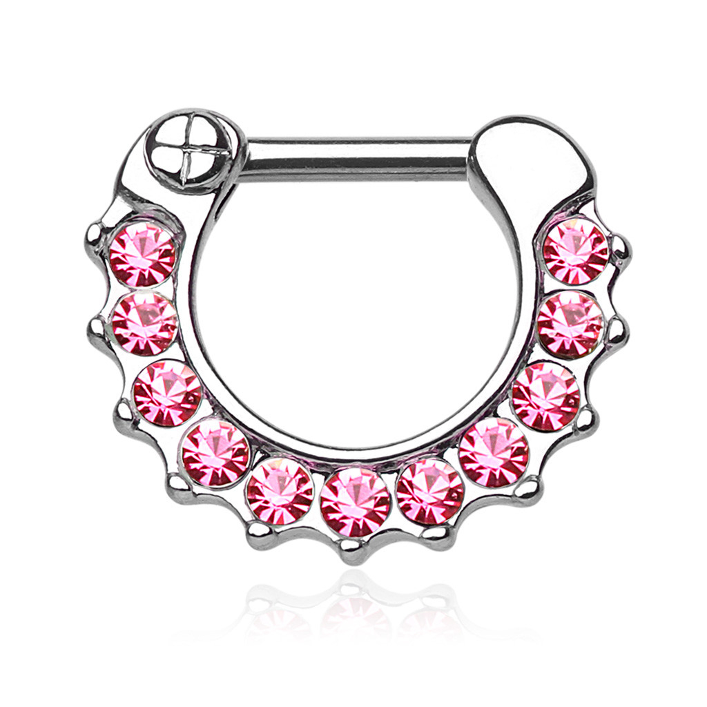 Acest clicker de sept este deorat cu pietre frumoase pe marginea care are o grosime de 3 mm. Sunt în total 11 pietre pe cercel, fațetate cu traietură de diamant. Această tăietură specială permite luminii să se reflecte din diferite unghiuri, deci este un cercel de septum unic.