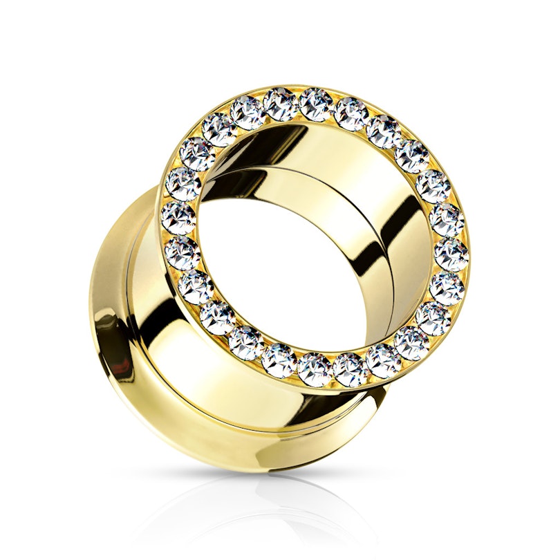Tunel este făcut din oțel chirurgical placat cu aur cu o margine decorată cu pietre albe mici. În afară de a fi un tunel frumos este de asemenea foarte confortabil cu o formă care se potrivește găurii urechii tale minunat.