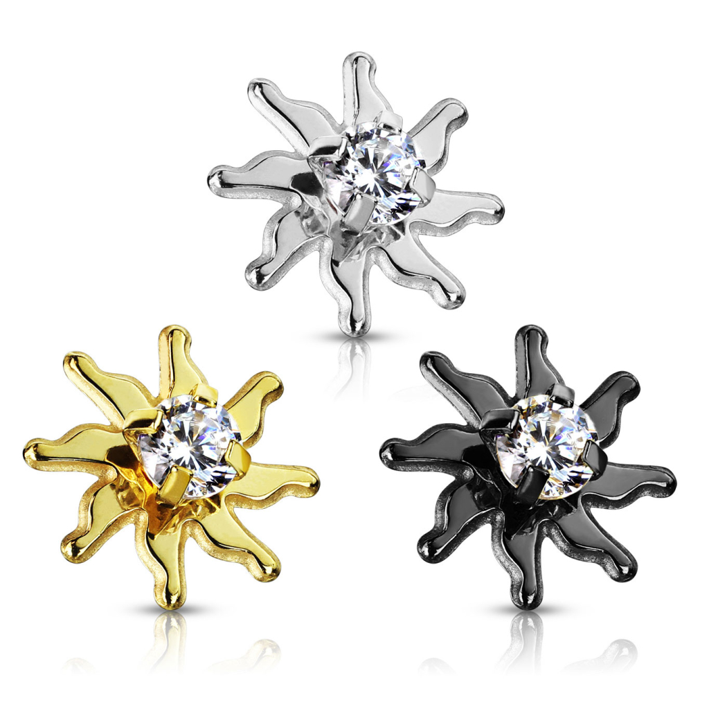 În centrul soarelui este o mică piatră de cristal prinsă în gheruțe de 2.5 mm. Poți obține soarele în trei culori diferite , depinzând de gusturile și stilul tău. Cele trei opțiuni sunt alb, auriu și negru. Orice culoare vei alege pentru soare, piatra centrală va fi întotdeauna transparentă. Singura diferență de la o piesă la altă piesă este culoarea soarelui.